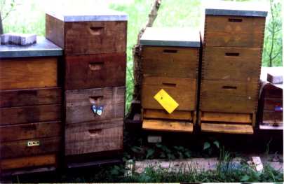 Frei aufgestellte Magazine mit je einem Bienenvolk. |